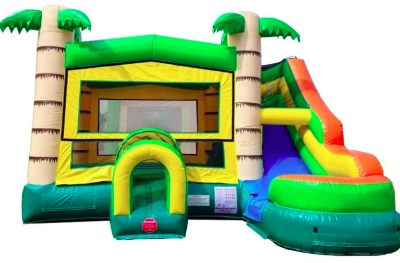 A tropical-themed house with a slide, adding a playful touch to your event.