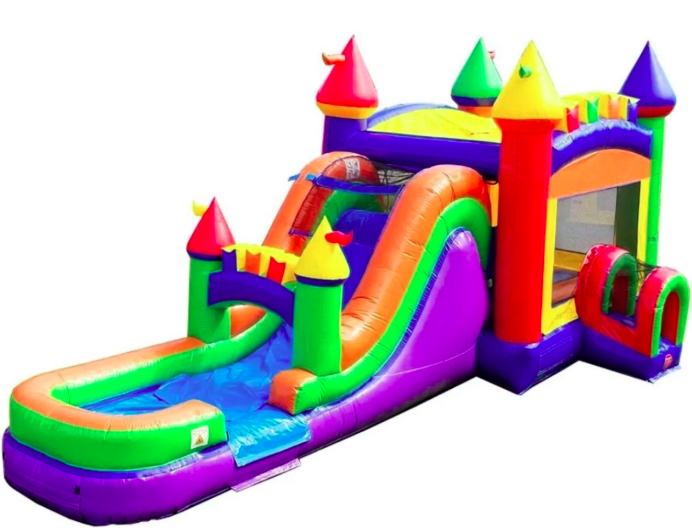 A vibrant castle with a fun slide, sure to be a hit with kids at any event.